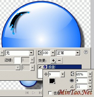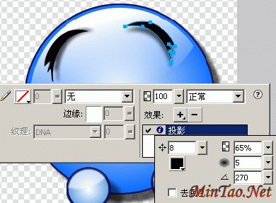 5.然后再绘制右边的眉毛,并填加“投影”效果,设置距离为9、不透明度为65%、柔化为4、角度为11。