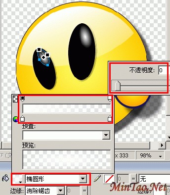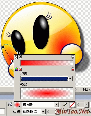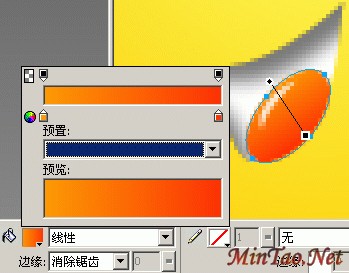 7.最后绘制漂亮MM红红的的小舌头,选择“椭圆工具”,在属性栏中设置“填充类别”为“线性”填充,左边颜色值为#FF9900,右边颜色值为#FF3300,边缘为“消除锯齿”,方向如图所示。还要绘制一个实心的反光哟!
