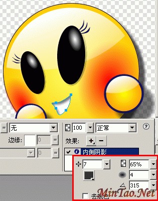 6.绘制出漂亮MM的樱桃小嘴,填充为“实心”白色,无描边,并填加“内侧阴影”效果,距离为7,不透明度为65%,柔化为4,角度为315。