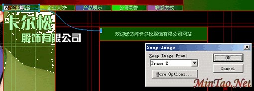 1、 单击"企业概况"按钮处的切片,此切片中心将出现一个圆形标志,用鼠标将其拖动到上一步创建的切片左上角,这将设置一个翻转效果,在弹出的对话框中设定鼠标滑过时交换为第二帧的内容,如下图所示: