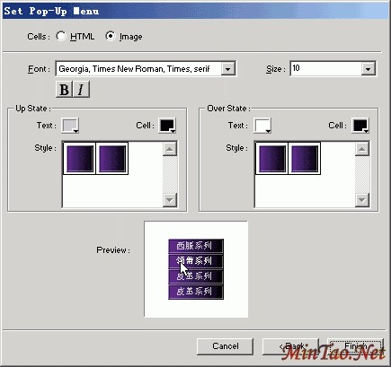 6、 当您选择了Image格式时,需要在下部的两个窗口设置Up和Over状态的菜单样式,您的悬想也许和我们这里的不同,这是因为我们使用了自定义的样式文件。我们可以根据不同设计项目的需要将自定义的样式作为弹出菜单的选项。