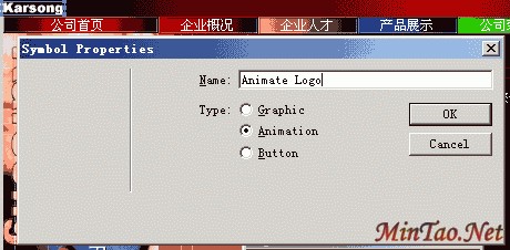 3、 选择此文字对象,按F8快捷键将其转换为一个动画符号,将其命名为"Animate Logo",符号类型为"Animation",如下图所示: