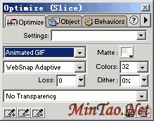 6、 打开优化面板Optimize设定此切片的类型为"Animated GIF",颜色数为32,如下图所示: