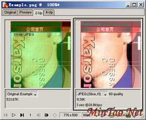 2、 选中左边人像部分的切片,打开优化面板,设定输出格式为JPEG,质量为60。