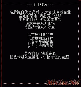 1、 启动Dreamweaver,在您的输出文件夹中打开刚才输出的Example.htm在中间的表格单元中选择文本,并改变其中的内容,在这段文本的最上端加入一句话"企业理念",然后改变文字的颜色为浅灰色。此时文本的样式如下图所示: