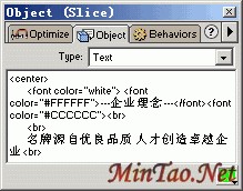 6、 选中文档中间部分的切片,打开Object面板,在对象类型里选择Text,在下部的窗口输入最终的文字内容。需要注意的是,您在这里不仅可以输入普通的文字内容,还可以输入标准的HTML格式内容,如我们输入的<center>和<font color="white">。这样最终的输出结果将根据这里的定义自动格式化文本。如下图所示: