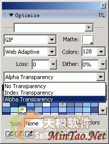 要改变透明色的设置,最简单的方法是使用优化面板左下方三支吸管工具,其功能如下: ? 在预览区单击 即可添加透明颜色。 ? 在预览区单击 即可移除透明颜色。 ? 在预览区单击 即可选择透明颜色。