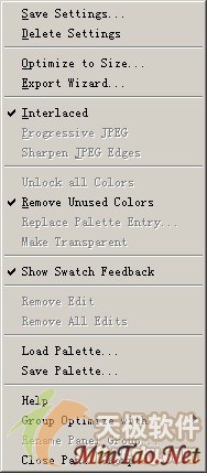 ? 在Optimize面板中的文件格式下拉列表框中选择需要的文件格式。 ? 设置相应文件格式的具体化选项。 ? 根据需要在优化面板的快捷菜单中选择其他的优化设置。