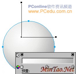 启动Fireworks,新建一个450*400大小的画布。在“工具”面板中点选“椭圆形”工具,然后在画布上先画一个179*179的正圆。接着在“属性”面板里将该圆的笔触颜色设置为无色。在“填充类别”里选择渐变选项中的“椭圆形”,然后在填充色的预选框中设立三个颜色滑块,其色彩数值从左至右依次为:#FFFFFF、#EAEAE8、#ADADAD。回到画布区后,再用“指针”工具调整该“椭圆形”渐变的填充手柄,如图01。