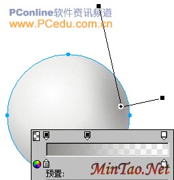为了使摄像头上的这个球形更有立体感,我们用“钢笔”工具在该圆形的右侧画出球形的反光区域,然后在“属性”框中对该路径采用无笔触描边的“线性”渐变填充,填充手柄的设置如图03所示,而“线性”渐变中左右两个色彩滑块的数值分别为:#FFFFFF、#EDEDEC。色彩滑块上左右两个不透明度滑块的百分比分别为:100%和0%。