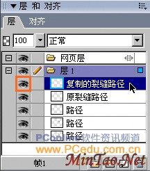 为了画出这些小裂缝的凹陷效果,我们需要有这样的两条路径配合才行。将这路径再复制一份,打开“层”面板后可以看到,刚复制出来的新路径会位于原路径的上一层。为了便于辨认,可以双击对象层中的名称,对这两个路径进行重命名,如图05所示。因为复制的这条路径要在稍候才需使用,因此可点击该对象层左边的“眼晴”图示,使该路径暂时处于不可编辑的隐藏状态。