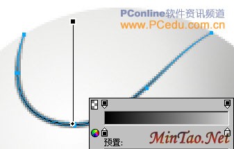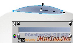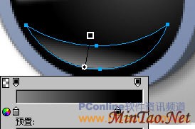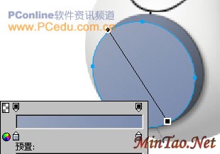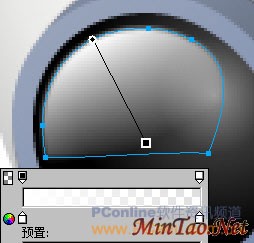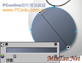 用“椭圆形”工具再绘制一个103*106大小的椭圆对象。将它移到黑色椭圆的正中位置,然后在“属性”面板里对这个椭圆对象使用无描边色的“线性”渐变填充,填充手柄的设置如图14所示。“线性”渐变中左右两个颜色滑块的数值分别为:#7E89A0和#434B56。
