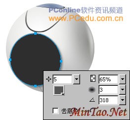 下面我们开始来绘制这个摄像头前部的镜头。用“椭圆形”工具画一个104*106大小的椭圆,然后把它移到摄像头的合适位置。接着在“属性”面板里对该椭圆进行无描色的实心填充,填充色为:#2E2E2E。在“边缘”选项中选择“羽化”,设置羽化数值为1。最后在“属性”面板的右侧为其添加一个“投影”特效,设置其投影色为:#555555。其它设置参数如图13所示。