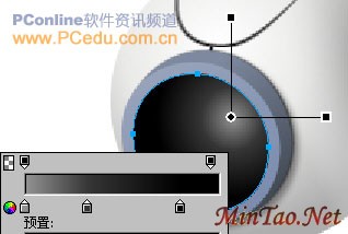 将这两个椭圆对象同时选中后,使用“修改——组合路径——打孔”菜单命令。使其形成一个月牙般的组合路径。把这个路径移至摄像镜头的下端后,在“属性”面板里为该对象使用无描边色的“线性”渐变填充。左右两个颜色渐变滑块的数值分别为:#888888和#000000。