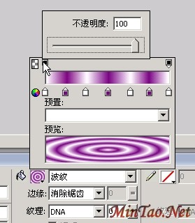 充分利用Fireworks的功能,我们可以轻轻松松用三帧打造出一个酷酷的小Banner。具体制作方法如下。 1. 新建一个360*60的画布,并用矩形工具拉出一个与画布一样大小的矩形。 2. 把刚刚拉出的矩形的填充选为“波纹”,并按下图设置。