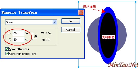 首先使用圆形工具画一个圆形,锁定当前层。然后新建一层,画一个椭圆,复制这个椭圆,在Modify菜单下选择数字变形命令(Numeric Transform),变形数字为80%,即这个椭圆比原始的大小缩小80%的尺寸。如图2