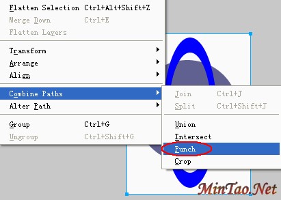 下面再画一个椭圆,不过位置有些特别,遮盖住椭圆环的一半,如图4,并且调节一下这个椭圆的节点使其沿着底图圆形的边缘,将它们选中并打孔。