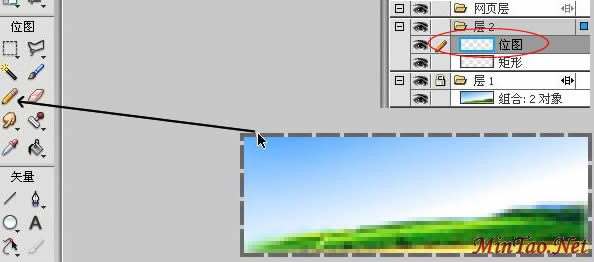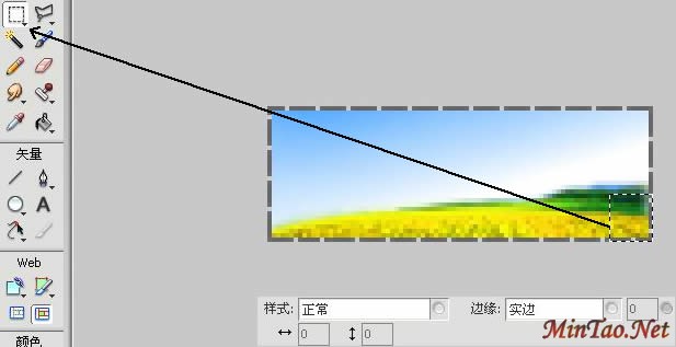 剪切稻田。选中层3里唯一的位图——(金灿灿的)稻田。用选取框工具自稻田右侧开始剪切,如图14: