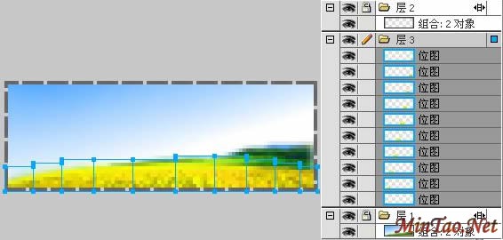 就本人学习fw2周来,感觉如果要做出比较像波浪的动画,和遮照、补间以及钢笔曲线方法比起来,笨方法——剪切位移来的更真实。理由是当风吹过稻田时,动的应该是整个稻田,而不仅仅是稻田的顶端,而且,风吹过后,稻田应基本回复原来的形状和颜色。