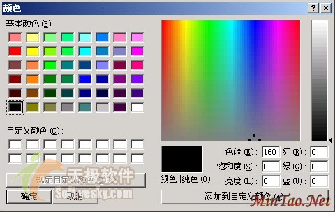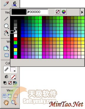 在这个活动色彩框的上部有个矩形的色彩块,其旁边文本框中显示了色彩的十六进值,上图的#000000就是黑色的十六进度值。右边的 按钮是无色按钮,选择了它可以将笔触色彩设为无色。 为系统色彩选取器按钮,点击它可以跳出系统调色板,我们可以使用这个系统调色版定制自己的色彩模式并且将其放置到Fireworks色彩中去,如图3所示。