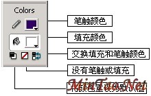 工具箱上的色彩部分包含笔触色彩和填充色彩两个部分,分别控制对象的笔触和填充的色彩。另外,工具箱上的色彩部分的下部还包含了 、 和 三个快捷按钮,分别代表了将色彩重设为默认值、将笔触和填充色彩设置设为无色、交换填充和笔触色彩,如图1所示。
