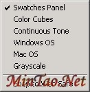 活动色彩框的右上角有个三角形的按钮,点击它我们会弹出色彩样本面板菜单,如图4所示。它分为两部分,上边第一个标题是“Swatches Panel”表示“色彩样本”,它下面有Color Cubes、Continuous Tone、Windows OS、Mac OS和Grayscale五个选项。其中“Color Cubes”(彩色立方体)表示的是按照不同的亮度将216种网页安全色彩样本分为6个彩色立方体来显示,它左侧的两列是这些色彩的基本色,接着用一个全是黑色的列将基本色彩和彩色立方体分隔开来,如图5所示。这是Fireworks MX 2004中的默认色彩设置;“Continuous Tone” (连续色调)将216种网页安全色完全按照色彩的种类来排序,使得色彩看起来是连续变化的。它的左边两列也是基本色,然后用一全为黑色的列将基本色和连续色块分隔开,如图6所示;“Windows OS”(Windows系统色)是用于显示适合于Windows系统的色彩样本,如图7所示;“Mac OS”(Mac系统色)是用于显示适合于Macintosh系统的色彩样本,如图8所示;“Grayscale”(灰度)则显示了256级灰度色彩的样本,如图9所示。