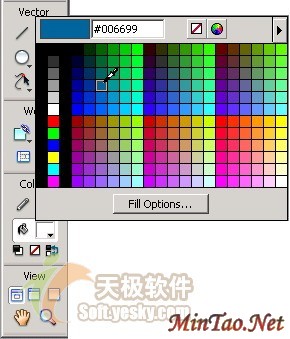 在工具箱中单击填充色彩框中的色彩块图标,这时候会出现填充的活动色彩框,它和笔触的活动色彩框类似,但是多了一个按钮 ,如图10所示。其中 按钮是用来控制填充选项的,选择它会出现填充选项浮动框。在这个活动色彩框中我们就可以为填充选取所需的色彩了,方法和笔触色彩完全一样。