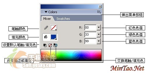 我们通过了解Fireworks MX 2004中色彩的使用方式、色彩面板以及色彩的管理,可以举一反三大致了解设计软件中的共有的色彩使用方法和技巧。 可以点击Fireworks界面中“Window”菜单下的“Mixer”(色彩混合器)或者“Swatches”(色彩样本),我们可以打开Fireworks的Colors(色彩)面板。我们发现色彩混色器和色彩样本是默认组合在Fireworks的色彩面板之上的。混色器面板上的各项功能如图13所示。
