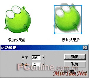 “运动模糊”也是Fireworks MX 2004中新添的特效功能。启用该特效时会弹出一个设置窗口。通过对其中相关数值的设置,将使图形对象产生直线型的运动模糊效果,如图12。