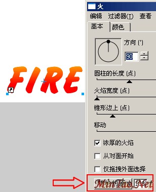 2、在元件的实例上应用Fire(火)滤镜,设置各项参数。(滤镜各参数设置请大家参考主站相关文章,此处应该注意,应用滤镜时从属性面板的效果菜单中选择,而不是从菜单栏处选择,这样是为了便于再次修改滤镜参数)