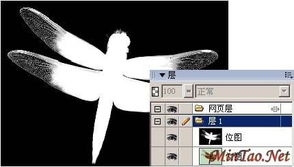 对于这张图,我先做了一个“反转”,又用“自动色阶”和“亮度、对比度”调整,所以Ctrl+Shift+Alt+Z再次将这张图平面化,这步非常重要。再用画笔修饰一下图片,把不需要透明的地方涂白,例如眼睛和翅膀的灰色部分。效果如(图3):
