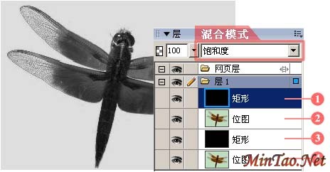 2、将第1层的混合模式改成“饱和度”,第2层的混合模式改成“红”、“绿”、“蓝”中任意一种,此时所显示的效果即和Photoshop中的RGB对应通道完全相同,和Photoshop一样,要选择一个比较理想的通道。我选了绿(G)通道,效果如(图2)所示: