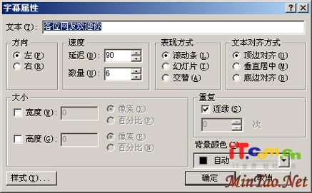 9、在该窗口的“样式”设置项处,我们将“实线”选项选中;在“颜色”设置项处将“灰色”选项选中;接着在该界面的“预览”设置项处,分别在表格的下边框应用按钮上以及右边框应用按钮上单击一下,这样就能将设置好的样式作用在表格的右边框和下边框上了; 10、完成上面的设置后退出样式设置界面,返回到Frontpage XP程序界面的编辑状态下,再用鼠标点击一下“预览”按钮,将界面切换到网页预览状态下,此时我们就能看到一个具有立体效果的表格出现了。 二、字幕上下移动特效 文字按左右方向移动的效果,在许多普通的网页中但能看到,但文字按上下方向滚动的效果却很少看到;这种效果设计起来是不是很难呢?其实,这种特效的设计思路与文字左右移动的设计方法几乎一致,只不过是略微修改一下代码就可以了,下面就是具体设计步骤: 1、打开FrontPage XP的编辑界面,将鼠标移动到需要插入文字滚动特效的位置处,再输入需要滚动显示的具体文字内容,比方说“各位网友欢迎你”; 2、再用鼠标将这个要滚动显示的文字选中,然后在菜单栏中用鼠标单击“插入”菜单项,并从中下拉菜单中依次执行“组件”/“字幕”命令,随后我们将看到一个标题为“字幕属性”的对话框,如图6所示;