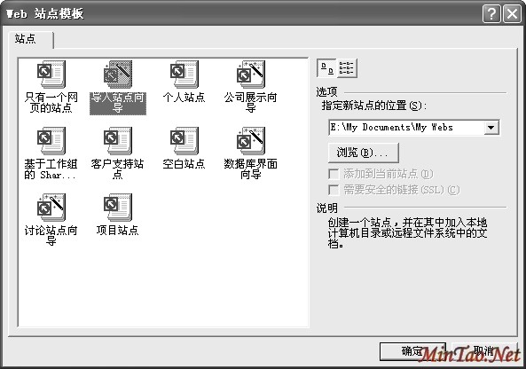 首先启动FrontPage XP,依次点击“文件”菜单中的“新建→网页或站点”命令,随后在程序的右侧弹出一个“新建网页或站点”任务栏,单击其中的“Web站点模板”命令,打开“Web站点模板”对话框(图1),选中其中的“导入站点向导”模板,在右侧的“指定新站点位置”输入欲导入站点的目标文件夹。单击“确定”按钮打开一个“站点导入向导-选择源”对话框。