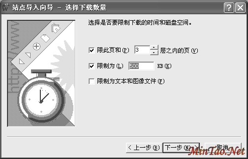 勾选“限此页和XX层之内的页”复选项,并输入需要导入层次的数目。这个参数限制FrontPage自动下载的范围,建议大家把搜索的层数限制在3层以内,因为网页的连接通常都比较多,如果下载的层数太多,就会造成过多的无效下载,反而浪费了带宽和资源。当然,如果不计较通信费用,可以试试多搜索几层。设置后勾选下面的“限此为XXKB”复选项,并输入导入文件需占用的硬盘空间。这个参数我们可以根据自己的需要进行设置,单位是KB。如果你只想导入文本和图像文件,而不包含任何组件、Java小程序和其他相关文件,则勾选“限制于文本和图像文件”复选框即可。