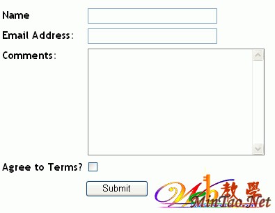 <form><label for="user">Name</label><input type="text" name="user" value="" /><br /><label for="emailaddress">Email Address:</label><input type="text" name="emailaddress" value="" /><br /><label for="comments">Comments:</label><textarea name="comments"></textarea><br /><label for="terms">Agree to Terms?</label><input type="checkbox" name="terms" class="boxes" /><br /><input type="submit" name="submitbutton" id="submitbutton" value="Submit" /></form>
