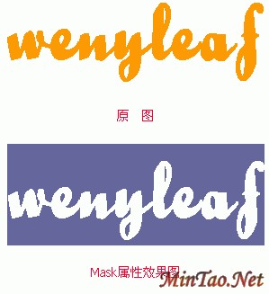 <html> <head> <title> mask filter </title> <style>//*设置CSS样式开始*// <!-- div{position:absolute;top:20;left:40; filter:mask(color:#666699);} //*定义DIV区域的样式,绝对定位,mask属性的color参数值指定用什么颜色遮 住对象*// p{font-family:bailey;font-size:72pt; font-weight:bold;color:#FF9900;} //*定义P区域内的样式,字体名称、大小、粗细、前景色*// --> </style> </head> <body> <div> <p> wenyleaf </p> </div> </body> </html>