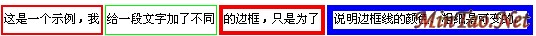 上面的示例中,给一段文字加了不同的边框,只是为了说明边框线的颜色、粗细是可变的。第一个边框的CSS代码是:style="border:thin solid red";“border”后面的三个参数的含义是:边框线的宽度是:thin(细线);边框线的类型:solid(实线);边框线的颜色:red(红色)。我们定义边框,实际上就是设定这三个参数值。 边框线的宽度有三个标准值:thin(细线)、medium(中粗线)和thick(粗线),此外,也可以自定义宽度,如:1pt、5px、2cm等。 边框线的类型有九个确定值:none(无边框线)、 dotted(由点组成的虚线)、 dashed(由短线组成的虚线)、 solid(实线)、 double(双线,双线宽度加上它们之间的空白部分的宽度就等于border-width定义的宽度)、 groove(3D沟槽状的边框)、 ridge(3D脊状的边框)、 inset(3D内嵌边框,颜色较深)、 outset(3D外嵌边框,颜色较浅),注意:如果系统不支持这些边框的属性值,那么“dotted”、“dashed”、“double”、“groove”、“ridge”、“inset”和“outset”都会被“solid”代替。 边框线的颜色:可以用十六进制的颜色代码,如#00ffcc。 从上面可以看出,给文本加边框确实很简单,上例中后面那几个边框的设置,我不讲你也明白了吧!在这里告诉你一点小技巧,给一段文本加边框,可把CSS加在〈P〉标记里;给几段文本加边框,先把那几段文本用DIV标记括起来,再把CSS加在〈DIV〉标记里;若是要给一行文本加几个不同的边框,则需要把文本放在表格里,再把CSS分别加到〈TD〉标记里。