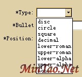 在“Style Definition for ol”对话框左边的选择窗口中选择“list”,在右边的面板上我们只要定义“Type”就行了,点一下右边那个三角形按钮,可看到如下图所示的列表: