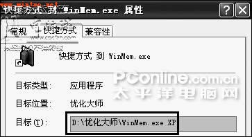 打开优化大师的安装目录,在WinMem.exe这个文件上点击鼠标右键,选择“发送到/桌面快捷方式”,然后在该快捷方式上点击右键,选择“属性”,将光标定位到“快捷方式”标签下的“目标”栏中,在“WinMem.exe”之后先输入一个空格,再输入大写字母“XP”(如图),点击“确定”。现在只要双击这个快捷方式就可以让桌面图标快速变得透明了。
