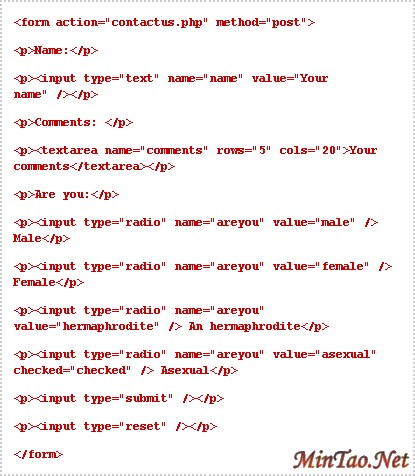 表单在使用中的完整的代码如下图。(注意:这种表单要是正常工作应该有一个 'contactus.php' 文件来处理表单的内容的,否则表单的数据不能正确处理的,或者我们在这里把这个文件改为:mailto:webmaster@webjx.com来实现提交邮件,其他方式就没有了)