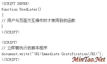 DEFER是脚本程序强大功能中的一个“无名英雄”。你可能从没有使用过它,但是看完这里的介绍后,相信你就离不开它。它告诉浏览器Script段包含了无需立即执行的代码,并且,与SRC属性联合使用,它还可以使这些脚本在后台被下载,前台的内容则正常显示给用户。