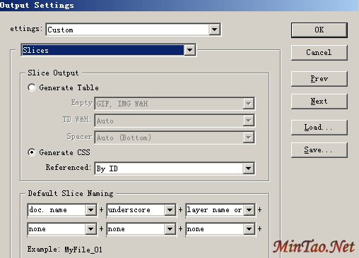 3、见图,在第二个下拉中选择 Slices,选择Generate CSS ,然后在后面的下拉中选By ID