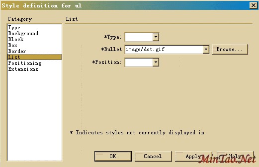 在“Style Definition for ul”对话框左边的选择窗口中选择“list”,在右边的面板上我们只要定义“bullet”就行了,实际上就是在输入框中输入图标的文件名(含相对路径),若不太记得清楚文件名,可按右面的“Browse...”打开文件夹选择。“Bullet”属性只有两个值:〈url〉:图片符号地址,也就是输入或选择带相对路径的图片文件名;“none”:没有自定义的图片符号。本例定义好“Bullet”后的对话框如上图所示,按OK按钮返回; 3、在“Edit Style Sheet”对话框上按“Done”按钮结束。在网页源代码的〈head〉与〈/head〉之间见到的CSS代码是这样的:〈style type=text/css〉〈!--ul { list-style: url(image/dot.gif)}--〉〈/style〉 对于不是使用Dreamweaver3的网友,直接把上述代码复制在〈head〉与〈/head〉之间,把蓝色部分换成你的图片文件名,产生的效果相同。 4、这样当我们在设计网页时,在属性面板上点击项目编号图标,就能获得自己的项目图片符号了,但在编辑时看到的还是默认的项目图片符号,只有在浏览时才显示其本来面目。这里要注意的是:一旦定义了“Bullet”属性且有效(即图片文件存在),则“Type”属性将不起作用,这就是为什么在上篇文章中我们在定义“Type”属性时要求不能定义“Bullet”属性的原因。 若是要使按下图标后也能达到上面的效果,只要在第一步中选择“Tag”标记时不要选“ul”而改为选“ol”,其它操作完全相同。得到的CSS代码是这样的:〈style type=text/css〉〈!--ol { list-style: url(image/dot.gif)}--〉〈/style〉 从这里可以看,这两个图标所起的作用基本相同,只是标记不同而已。 从上面的“Style Definition for ul”对话框中还有一个属性:“position”,它只有两个值,“inside”和“outside”,它们的作用是决定列项中的第二行文字的起始位置。其中“outside”是默认值,其效果就是本文例子中的效果;“position”属性选择“inside”时的效果如下所示: