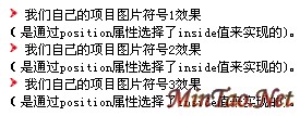 从上面的例子中可以看出,选择“inside”时,列项的第二行(及以后所有行)的左边距与列项第一行的项目符号对齐;选择“outside”时列项的第二行(及以后所有行)的左边距与列项第一行除了项目符号外的第一个字符对齐。