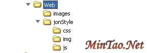 其中,[images] 是存放xHTML中出现的图片,[jonStyle]统称之为主题包,在样式包中包括了[CSS]、[img]、[js]分别存放CSS样式表、样式表中所引用的图片、网页中所用的JS。这里存放图片的[img]与外面的[images]虽然都是存放图片的,但是这里的图片的性质却是不一样的。 [img]是CSS中所引用的图片,所有的图片的显示与否都与CSS样式有关,他的归属性是,[img]里的图片是归属于CSS的,而不是XHTML的。而CSS是不会引用[images]中的图片。[images]中的图片只归属于xHTML,xHTML也不要直接使用[img]中的图片。