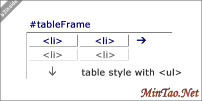 其中每个li只负责右边、下边的线,配以float:left;来完成横向排列,最外边的div则只定义上边、左边的线,用以显示表格完整线条。这种做法的好处是更加灵活,你可以由ul中事先定义好的任意两个class来控制线的颜色,整体语意也更加清晰,可见CSS有多么的灵活 :p