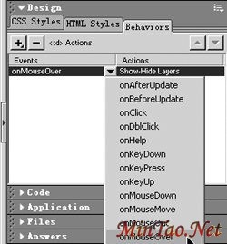 选择主菜单中的“菜单一”,用快捷键“Shift+F3”打开“Behaviors”行为窗口,单击“+”按钮,执行菜单“Show-Hide Layers”命令,于弹出窗口中选择“Layer‘Layer1’”,点击“Show”按钮,然后设置其两层为“Hide”。该动作表示把“Layer1”显示,而其他层均隐藏。最后点击“Behaviors”窗口“Events”下刚才定义的行为右侧的箭头,于弹出菜单中选择“onMouseOver”鼠标响应事件。
