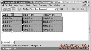 插入菜单栏目光标移入表格第一列,执行菜单“Insert/Layer”命令插入一个新层,作为“菜单一”的下拉菜单,点击层内部,执行“Insert/Table”命令,设定该表格行数、列数,并将表格线宽度设为“0”,表格底色为喜好颜色,输入菜单项目文字,设定文字CSS控制效果,并调整菜单大小。以同样的方式做出其他下拉菜单图层效果。