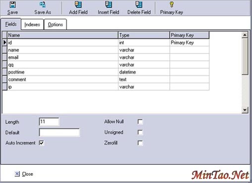 接下来就是设计book表中的字段,下面是基本的信息,大家也可以根据自己的需要自行修改 id(留言自动编号,主键) name(留言姓名,varchar,不允许为空) email(留言者电邮,varchar,允许为空) QQ(留言者QQ号码,varchar,允许为空) posttime(留言提交时间,datetime,不允许为空) comment(留言内容,varchar,不允许为空) IP(留言者IP,varchar,不允许为空)